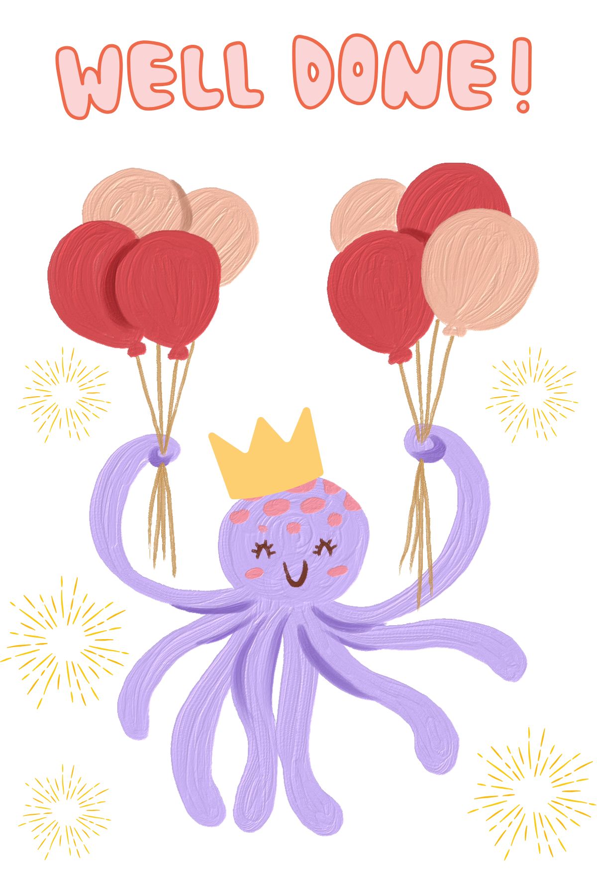 Celebrate success with this cheerful well done card featuring a joyful octopus holding colorful balloons — a fun and encouraging way for tutors, teachers, or staff to recognise and motivate students and colleagues.
